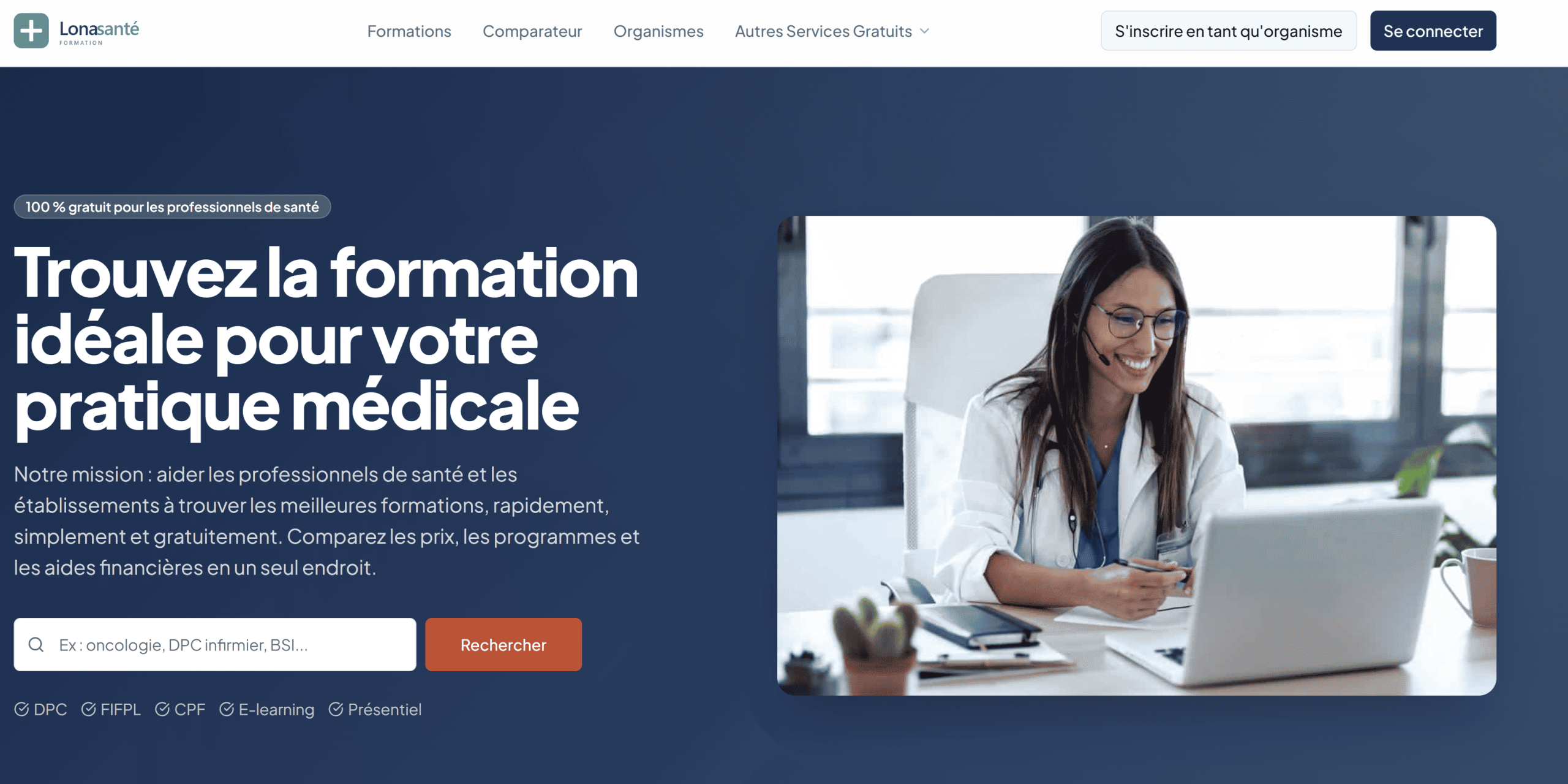 Lonasanté Formation (lonasanteformation.fr) est une plateforme en ligne qui réunit en un seul endroit les formations de plusieurs organismes du secteur santé. Elle prolonge la mission de Lonasanté.com : aider les professionnels de santé à trouver rapidement la bonne formation, sans démarchage et sans frais cachés.